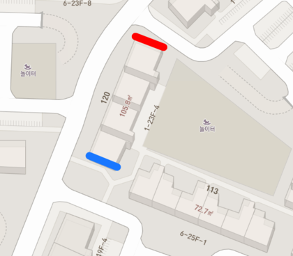 하지만 빨간색 부분의 끝 집은 층이 높아도 해가 거의 들어오지 않기 때문에 춥고 결로 및 곰팡이가 생기는 경우가 많아서 단열 공사를 따로 해야 하는 경우가 많습니다.