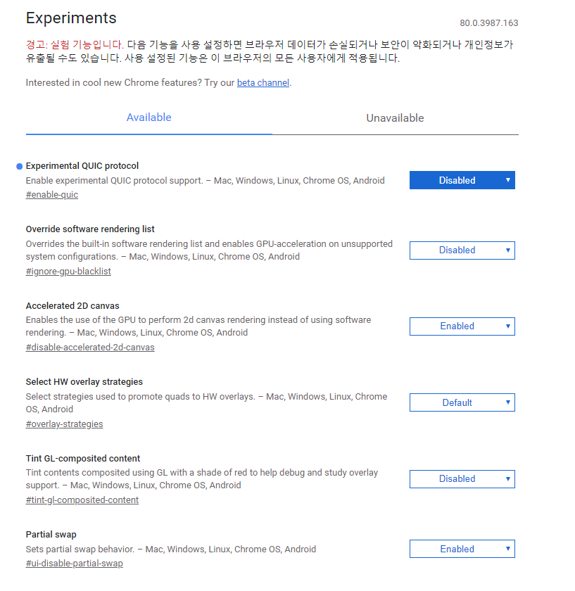 flags 들어가서 알트 + F로 Experimental QUIC protocol 를 찾고 default 로 되있는 것 disabled로 바꾸면 됨